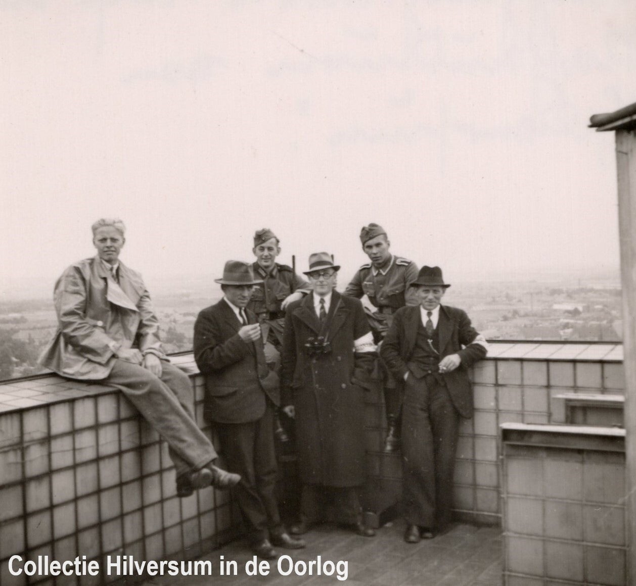 Leden van de Luchtbeschermingsdienst samen met Duitse Wehrmacht-militairen in de toren van het Raadhuis, 1940. Collectie Hilversum in de Oorlog