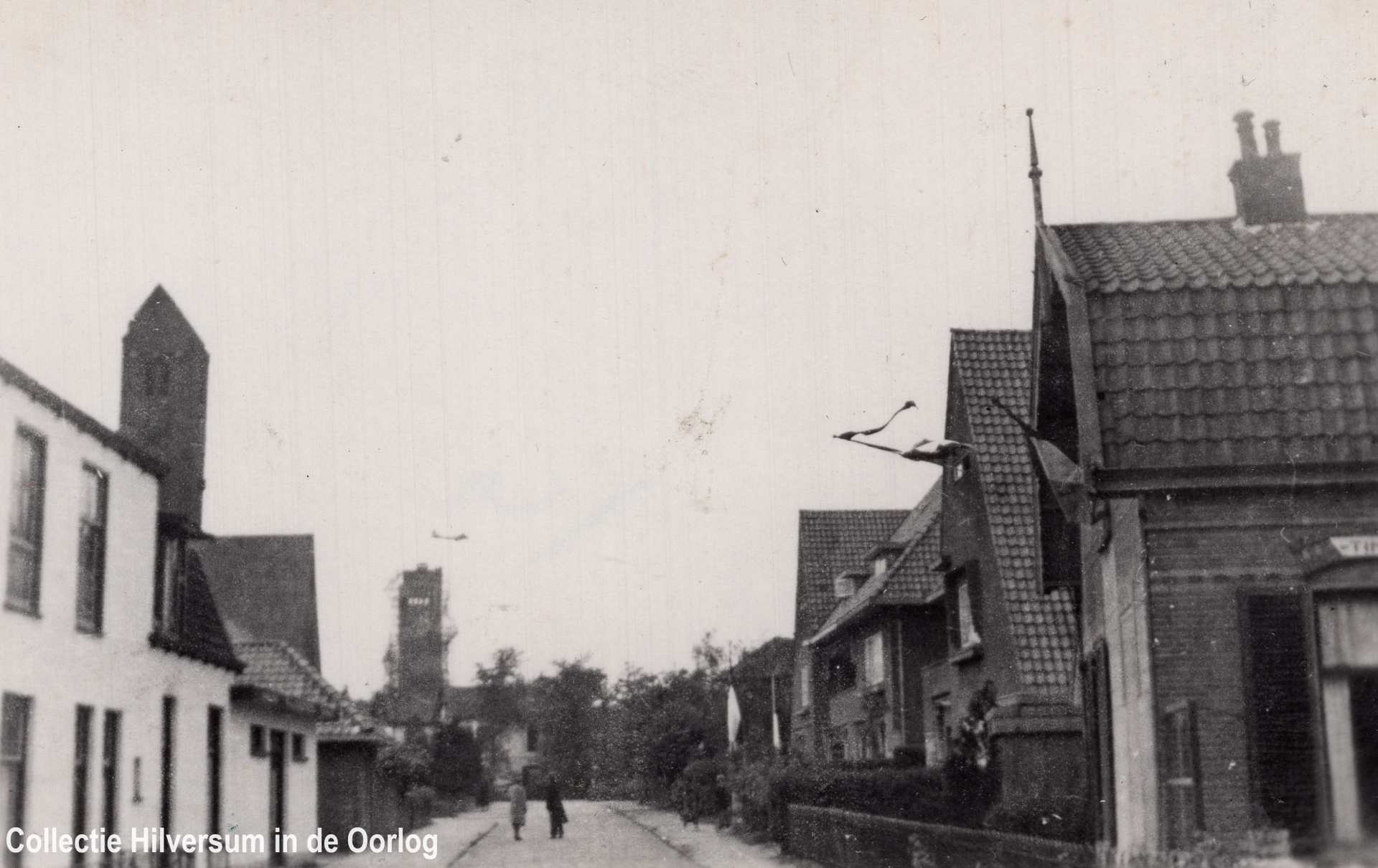 Het gecamoufleerde Raadhuis met daarboven een Amerikaans vliegtuig, tijdens de voedseldroppings, gemaakt vanaf de Tesselschadelaan. Collectie Hilversum in de Oorlog
