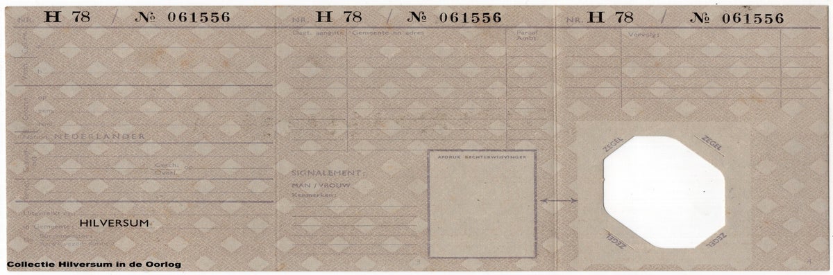 Blanco persoonsbewijs uit Hilversum. Collectie Hilversum in de Oorlog