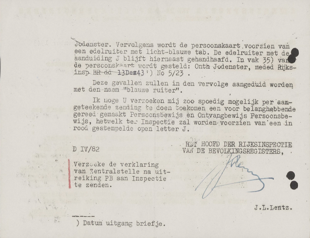 Vanaf 3 juli 1941 werden alle Joden verplicht om een J-stempel op de voor- en achterkant van hun persoonsbewijs te laten stempelen. Dit was verordend door SS-Obergrüppenführer en politiechef Hanns Albin Rauter. Zo werd het de Duitsers makkelijker gemaakt om Joden te identificeren tijdens (straat)controles.