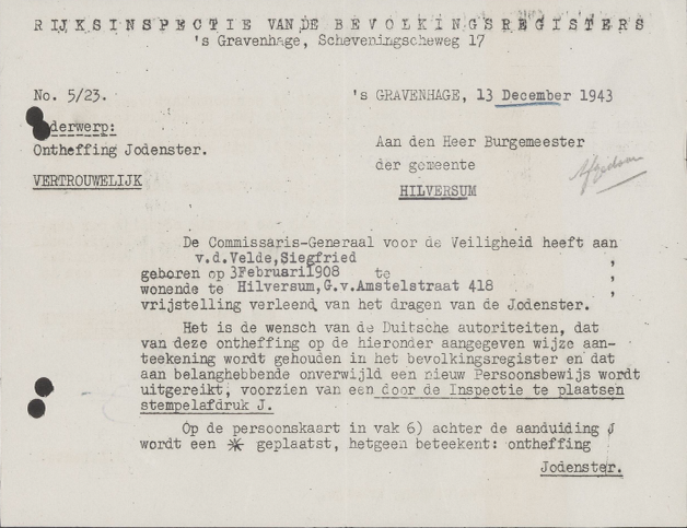 1 en 2: Brief van de Rijksinspectie van de Bevolkingsregisters te Den Haag aan de burgemeester van Hilversum over de ontheffing van het dragen van een Jodenster voor Siegfried van der Velde, 13 december 1943. Ondertekend door Lentz.