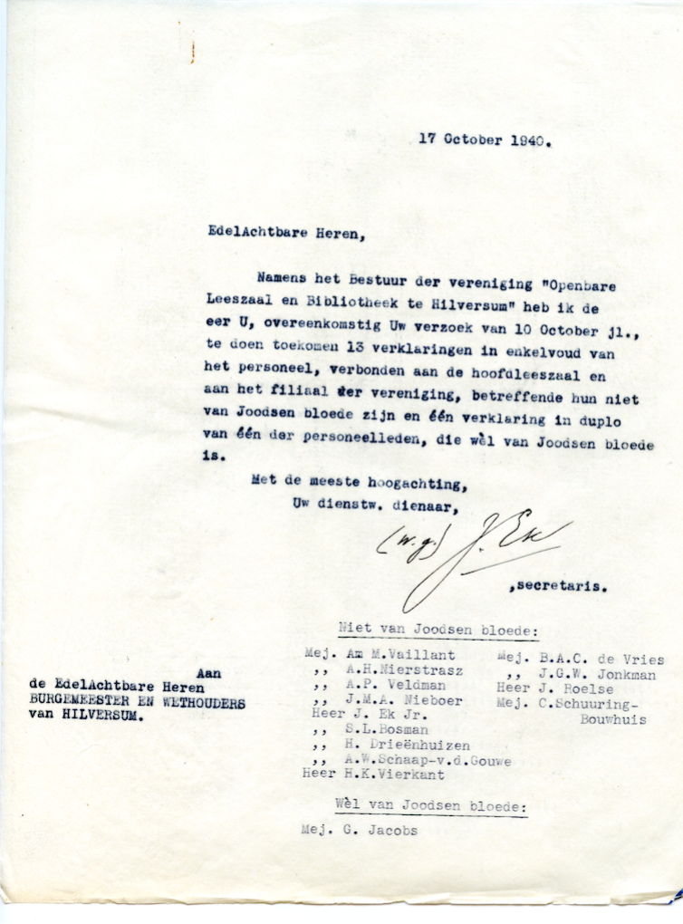 Brief van de bibliotheek aan B&W Hilversum, 17 oktober 1940. Bron: Archief Bibliotheek Hilversum