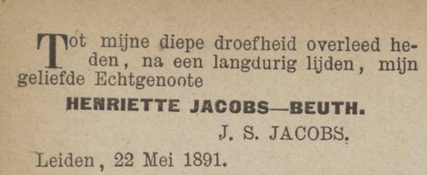 Rouwadvertentie Henriëtte Jacobs-Beuth, de moeder van Gonda Jacobs, uit de Zutphense Courant, 28 mei 1891. Via Delpher.nl