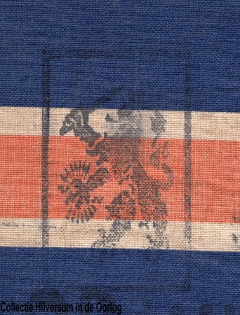 NBS-armband uit Gewest 9 'Het Gooi' in de kenmerkende blauw-wit-oranje kleurstelling. De armbanden waren gemaakt van zonwering stof. Collectie Hilversum in de Oorlog