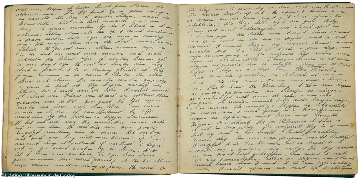 't Is 22 Nov mijn vrouw wordt vandaag 31 jaar. Ik werk op die dag voor 't eerst bij 'n boer met Coen Zonderman. De vrouw helpt zelf ook. Ze spant 2 koeien voor de wagen, en we gaan mest op het land rijden en uitstrooien. Die dag hebben wij 't zeer goed. Volop brood met worst. Middageten met 'n stuk spek en 3 borden pap. We zitten voor 't eerst sinds 1 maand weer op 'n stoel en eten aan 'n tafel, wat is dat vreemd. ’s Avonds krijgen wij worstenbrood, o wat smaakte dat. Zoo heb ik toch 'n goeie dag, nu mijn vrouw jarig is. De volgende dag maar weer naar de Bouwstelle. 's Morgens worden er al weer klappen uitgedeeld door de moffen. Joop van de Eikel krijgt 'n klap en 'n schop van Heer Fischer. Dat was de opzichter. 'n Bloedhond van 'n kerel.