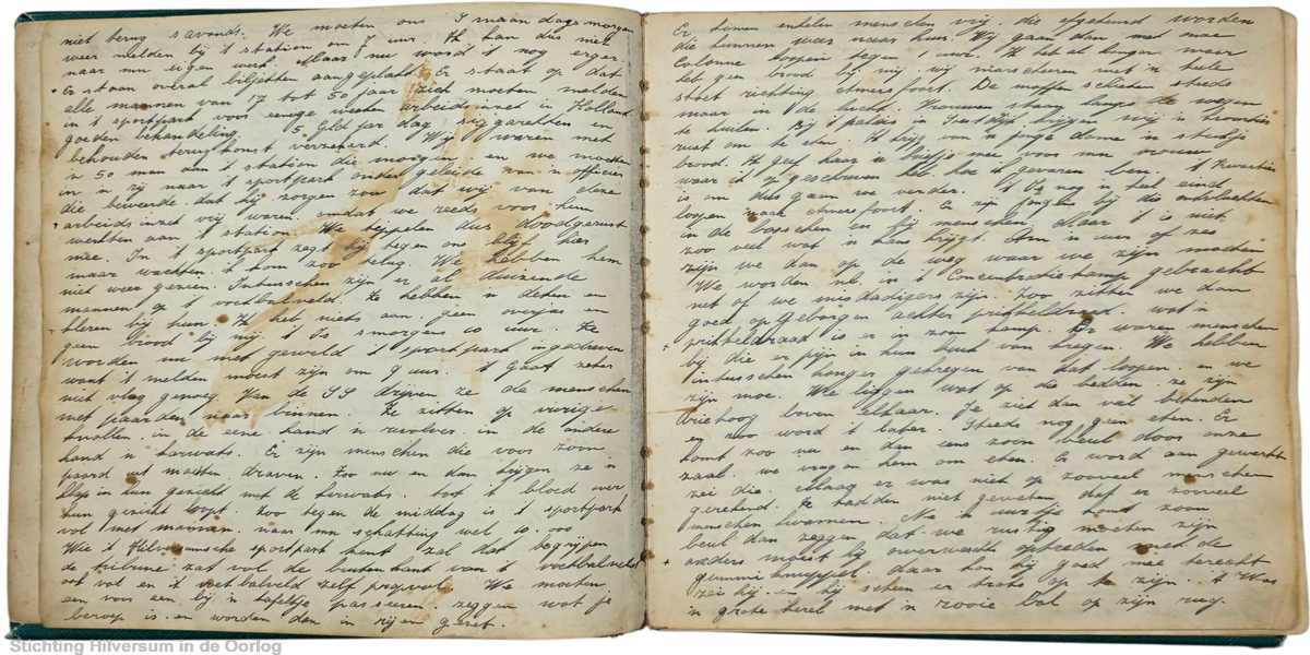 We moeten ons 's maandagsmorgen weer melden bij ‘t station om 7 uur. Ik kan dus niet naar m'n eigen werk. Maar nu word ‘t nog erger. Er staan overal biljetten aangeplakt. Er staat op dat alle mannen van 17 tot 50 jaar zich moeten melden in ‘t sportpark voor eenige weeken arbeidsinzet in Holland, goeden behandeling, 5 Gld per dag, siggaretten en behouden terugkomst verzekerd. Wij waren met ‘n 50 man aan ‘t station die morgen. En we moesten in ‘n rij naar het sportpark onder geleide van ‘n officier die beweerde, dat hij zorgen zou dat wij van deze arbeidsinzet vrij waren, omdat we reeds voor hun werkten aan ‘t station. We tippelen dus doodgerust mee. In het sportpark zegt hij tegen ons blijf hier maar wachten, ik kom zoo terug. We hebben hem niet weer gezien. Intusschen zijn er al duizende mannen op ‘t voetbalveld. Ze hebben ‘n deken en kleren bij hun. Ik heb niets aan, geen overjas en geen brood bij mij. ‘t Is 's morgens 10 uur. Ze worden nu met geweld ‘t sportpark ingedreven want ‘t melden moest zijn om 9 uur. ‘t Gaat zeker niet vlug genoeg.