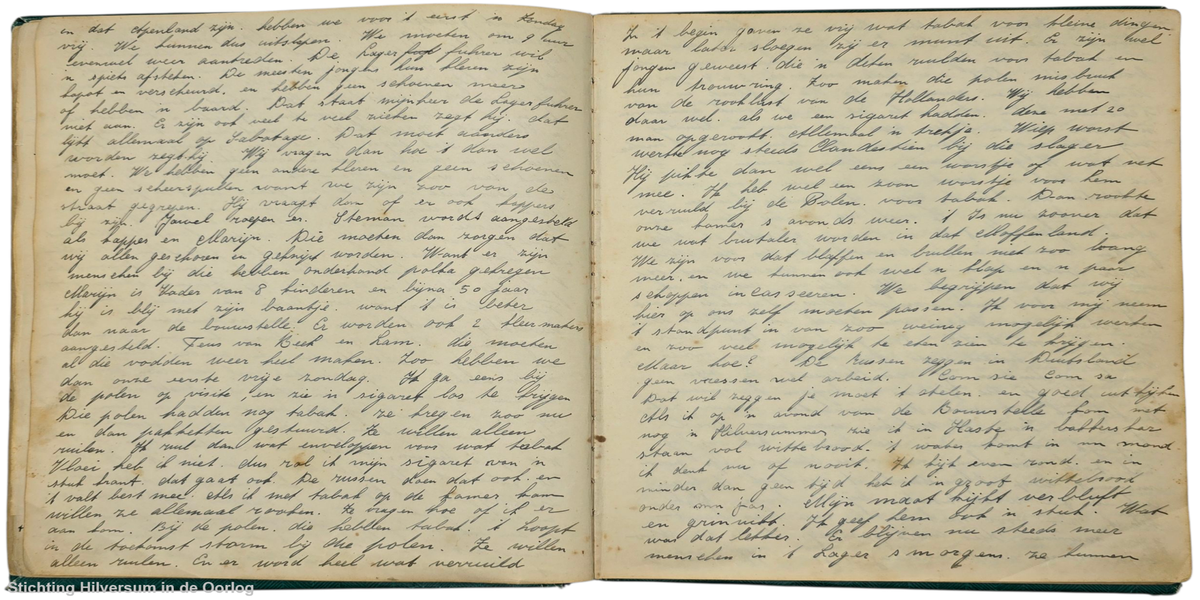 't Is 14 Maart. Vrouw van Beek uit de Bakkerstraat is in ons kamp. Ze is komen fietsen uit Hilversum om haar 2 jongens te bezoeken die allebei ernstig ziek zijn, ze hebben alle twee in 'n straflager gezeten, en zijn nu dood ziek terug 'n Heele prestatie van vrouw van Beek om van Hilversum op de fiets, naar Osnabruck te rijden. Ze wist dat haar jongens erg ziek waren. Ze kwam juist op tijd vertelden zij. Een van haar jongens lag in Bramsche in de ziekenbarak en een in Onsabruck. Er kwamen ook transporten Russische en Letlandsche vrouwen in ons kap met kleine kinderen. O Wat zagen die vrouwen en kindertjes eruit. Ze zaten ook onder de luizen. Die kleine kinderen van 3 jaar waren aan 't vangen. Toen ze aankwamen met karretjes en wagentjes, was 't een armoedig gezicht. Ze zijn nog maar net in 't kamp gearriveerd, of ze leggen vuurtjes aan tusschen 'n paar steenen, en in 'n minimum van tijd zijn ze aan 't koken. Weer anderen kleden zich uit en gaan rustig in 't gras zitten te luizen vangen.