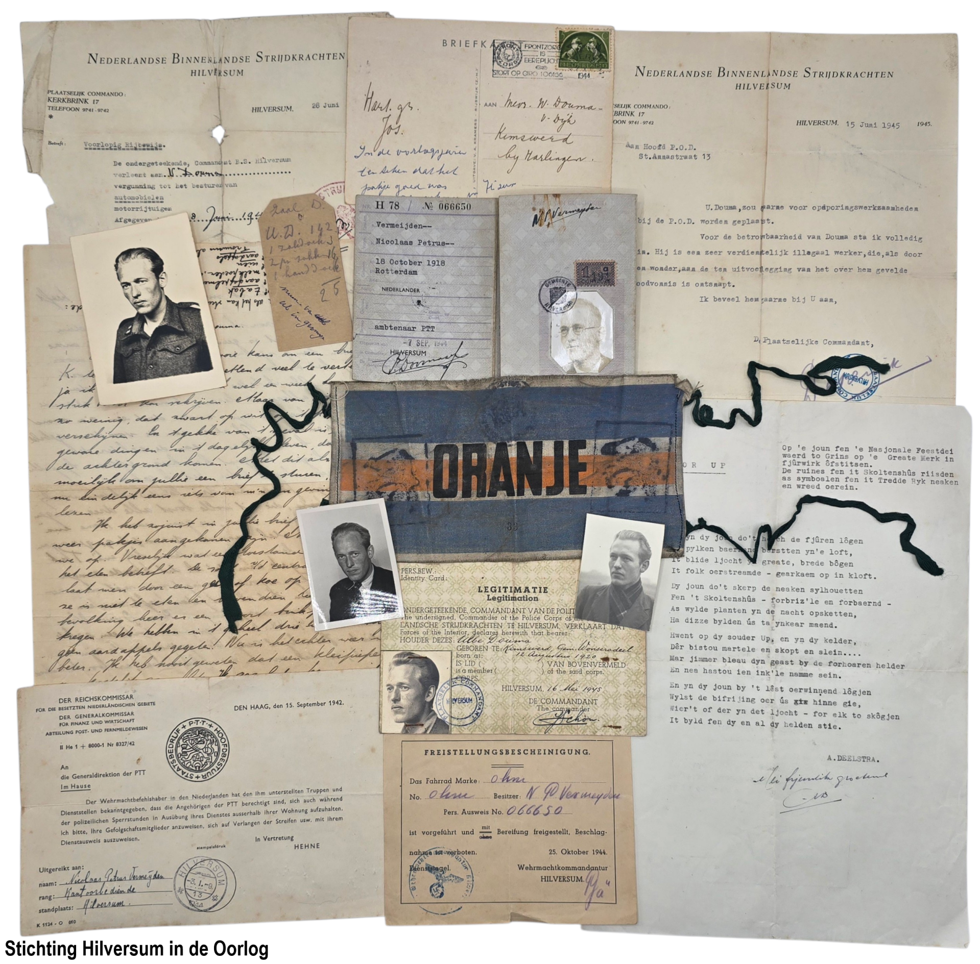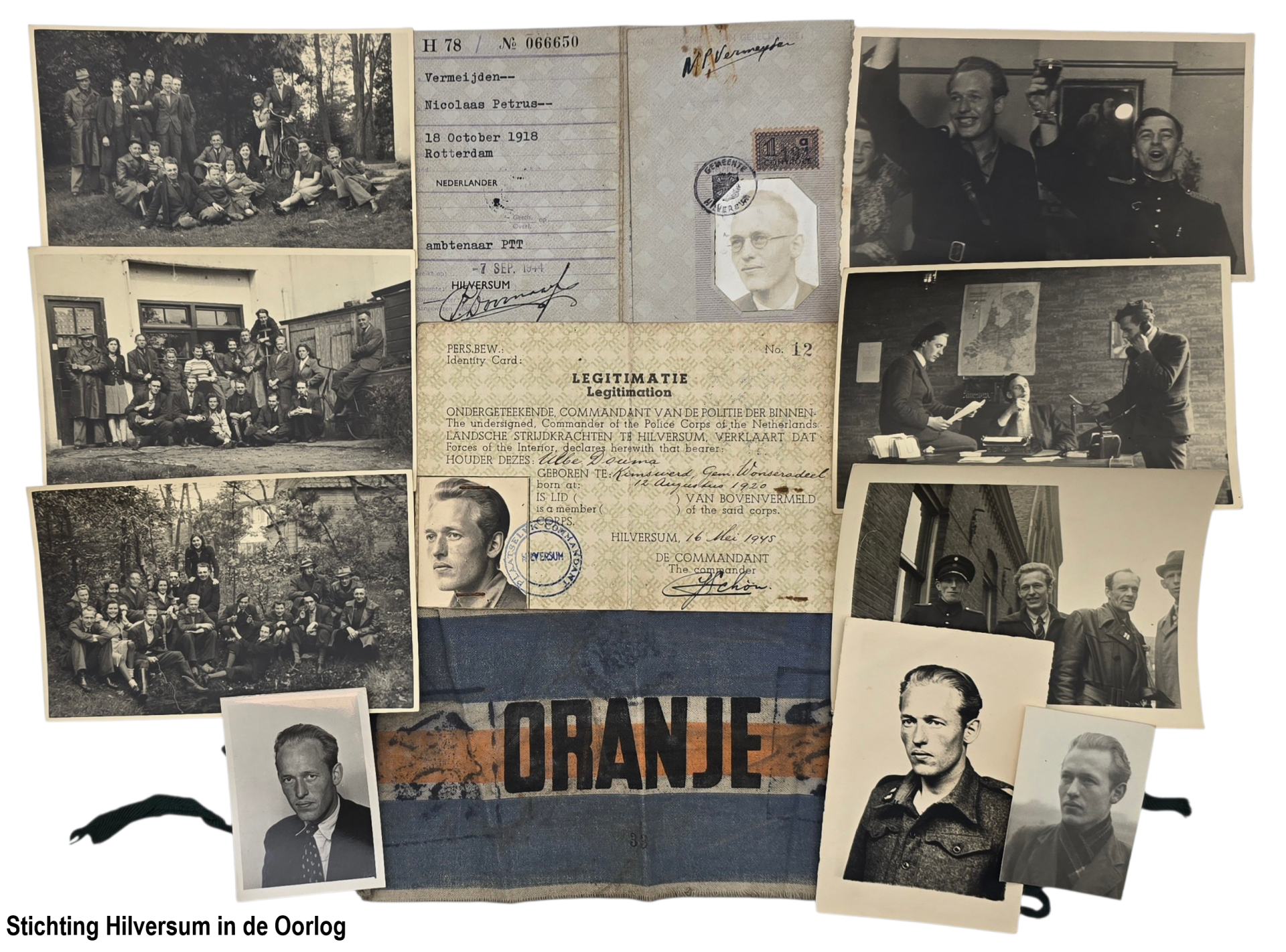 Van Leny Moolhuizen ontvingen wij diverse persoonlijke documenten, waaronder stamkaarten en persoonsbewijzen van haar familie. Ook zat hier een fotoserie van het opblazen van de NSF-zendmasten in Hilversum bij. Tot slot kregen wij een aantal bevrijdingsbrochures en boeken van mevrouw Moolhuizen.